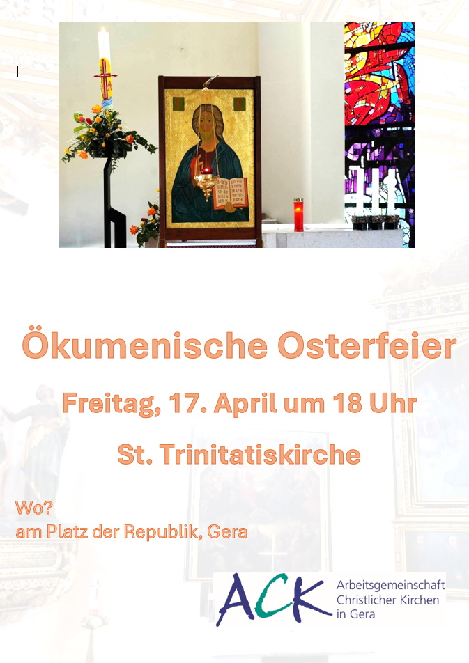 Da das orthodoxe Osterfest erst am vergangenen Sonntag begangen wurde, haben sich die Mitwirkenden aus den unterschiedlichen Konfessionen auf ein späteres Datum für den ökumenischen Gottesdienst geeinigt. „Im christlichen Verständnis sprechen wir schließlich von einer Osterzeit, nicht nur von einem Tag“, erklärt Andreas Martz, Vorsitzender der Arbeitsgemeinschaft Christlicher Kirchen (ACK) in Gera. „Somit darf auch über das eigentliche Auferstehungsfest hinaus gemeinsam an Ostern erinnert und gefeiert werden. Die ACK Gera möchte in der Vielfalt der christlichen Konfessionen ein Zeichen für den Frieden setzen.“