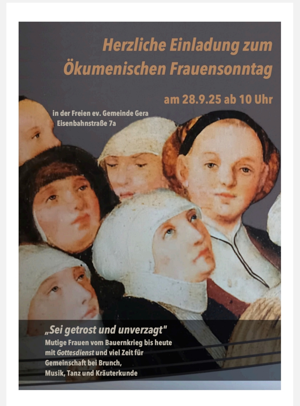Unter dem Motto „Sei mutig und stark“ durften wir als FeG Gera am 28. September Gastgeber für einen ökumenischen Frauensonntag sein. Natürlich waren alle interessierten Männer ausdrücklich willkommen. Das ausschließlich weibliche Vorbereitungsteam gestaltete in Wortbeiträgen, mit Musik und Tanz diesen Tag, der Geschwister aus einigen Gemeinden Geras zusammenführte. Cornelia Thiem versuchte in der Predigt, die Schicksale der Frauen des Bauernkriegs vor 500 Jahren bis in unsere Zeit unter dem Aspekt der Ermutigung aus dem Wort Gottes vorzustellen. Natürlich war dies nur mit einer knappen Auswahl möglich. Deutlich aber wurde, dass sich einige Herausforderungen, denen sich Frauen gegenübersehen, bis heute kaum geändert haben. Umso ermutigender, dass der Zuspruch Gottes uneingeschränkt gilt: Sei mutig und entschlossen!